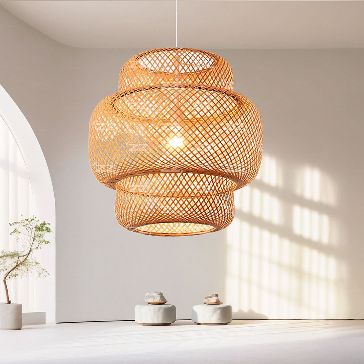 Autenticidade em Cada Detalhe: Artesanalmente feito em bambu, o Lustre Pendente Rústico Cayman 35 Fio Branco transforma sua casa com um toque único e natural.